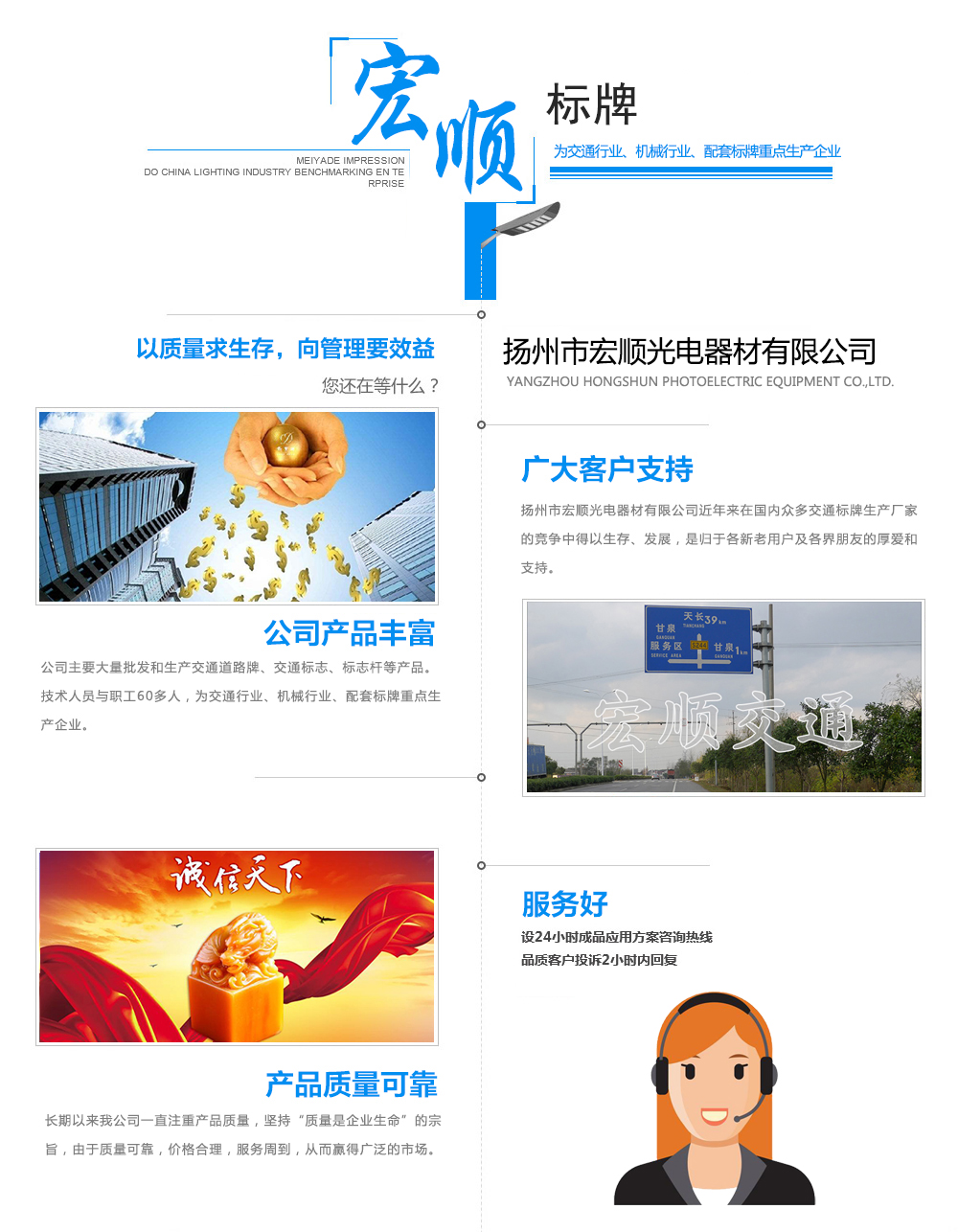 揚州市宏順光電器材有限公司近年來在國內眾多交通標牌生產廠家的競爭中得以生存、發(fā)展,是歸于各新老用戶及各界朋友的厚愛和支持。我們全體員工向你們致以誠摯的感謝。 為使我們共同步入新世紀,提高我們的產品質量與服務希望對我們提出寶貴的意見,使我們不斷改進、創(chuàng)新。 我們將和過去一樣,視今天的質量為明天的市場。為您奉獻滿意的各種精品,為美化我們的交通事業做出貢獻。 公司主要大量批發(fā)和生產道路交通標志牌、道路指示牌、交通標志牌、指路牌、反光標志牌等產品。技術人員與職工60多人,為交通行業、機械行業、配套標牌重點生產企業。 長期以來我公司一直注重產品質量,堅持“質量是企業生命”的宗旨,由于質量可靠,價格合理,服務周到,從而贏得廣泛的市場,近年來隨著交通事業的開發(fā)和研究,傾聽用戶的意見,使得我們在市場競爭中不斷發(fā)展壯大。 我們本著“質量可靠、信譽優(yōu)先、用戶至上”的宗旨,“以質量求生存,向管理要效益”的信條,竭誠為... ...【查看更多】